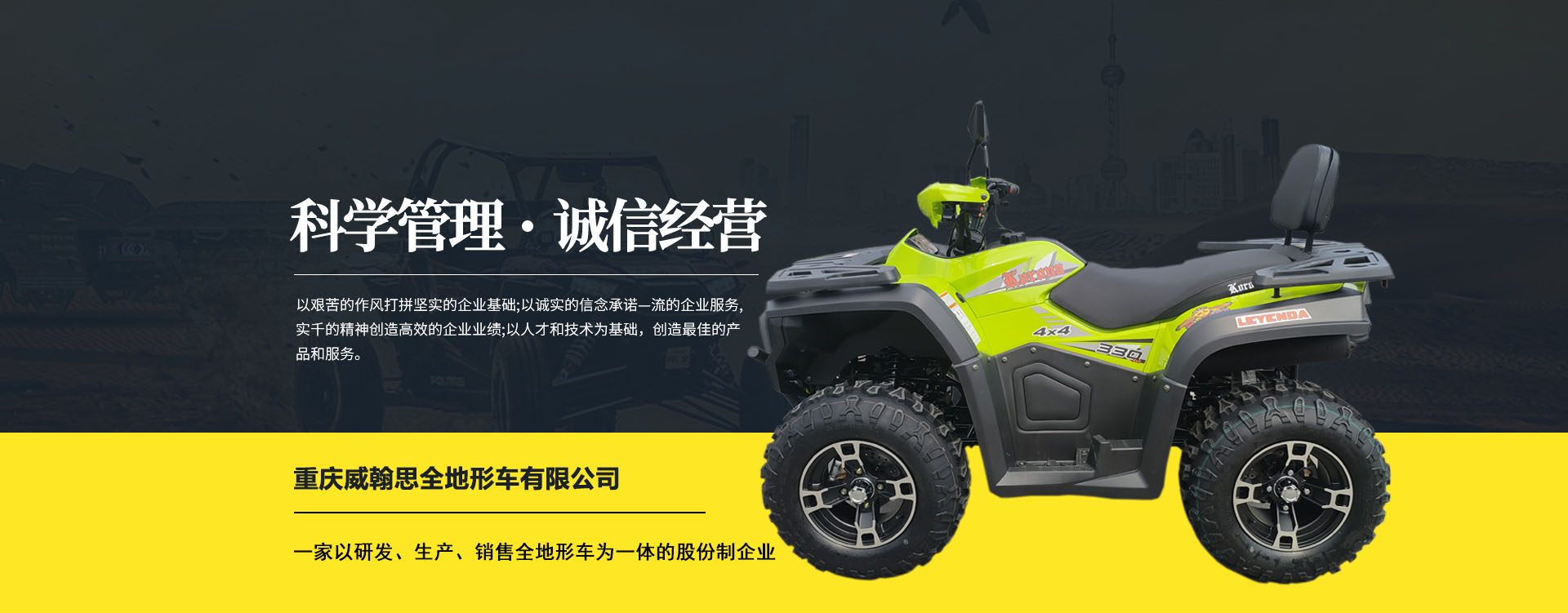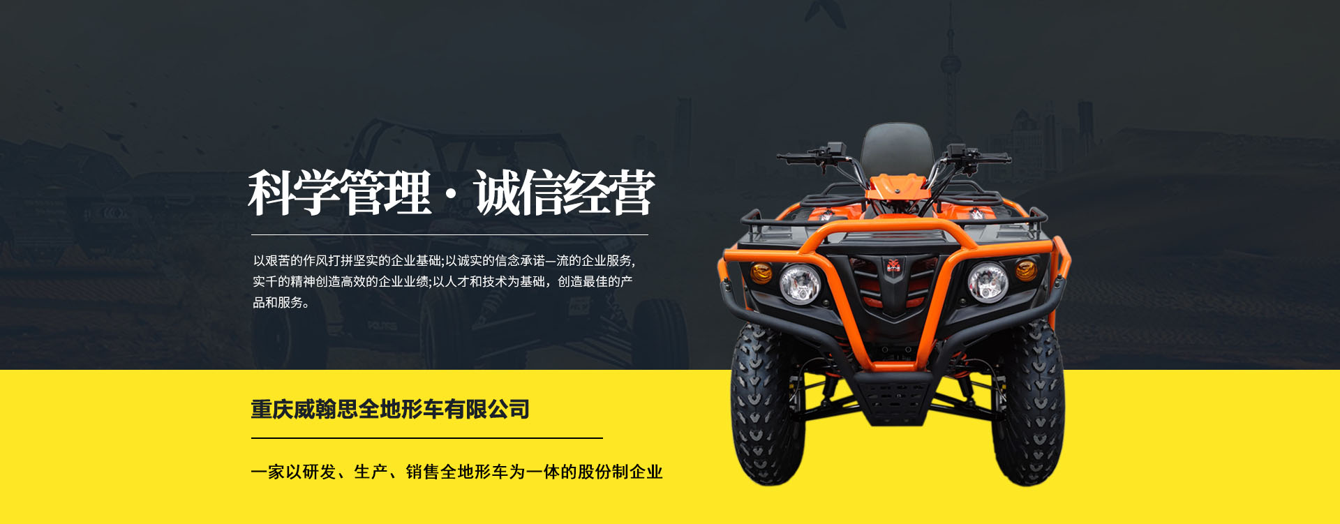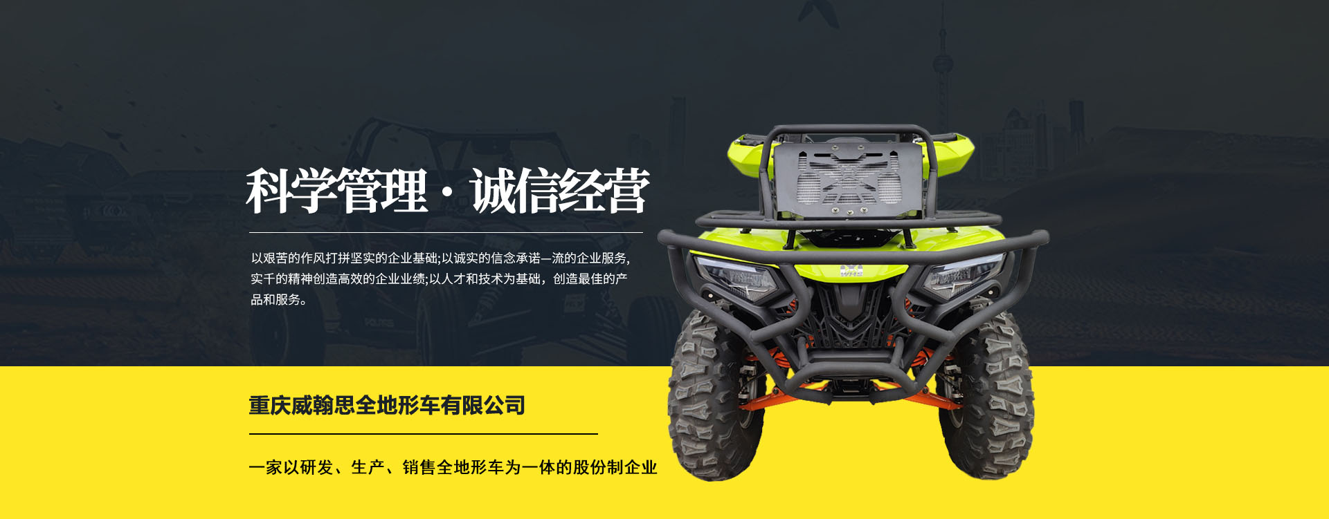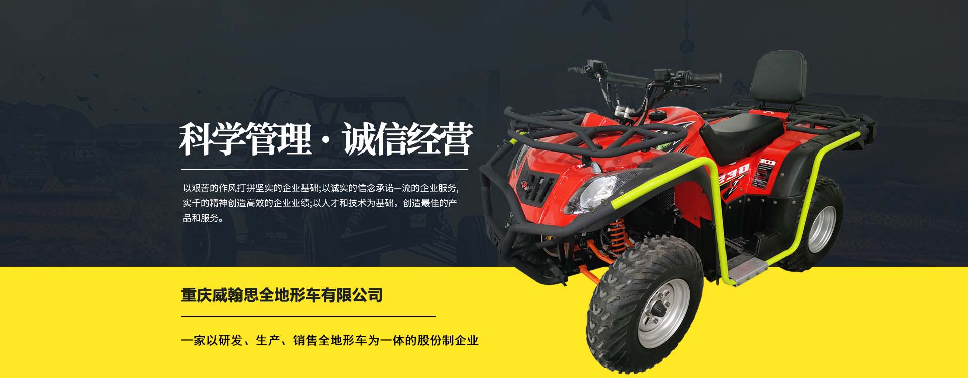 重慶威翰思全地形車有限公司成立于2016年9月,一家以研發(fā)、生產(chǎn)、銷售全地形車為一體的股份制企業(yè)。公司銷售額超過5000萬。現(xiàn)有專業(yè)市場售后服務(wù)團隊。公司秉承“敬業(yè)、超越、活力、用戶至上”的企業(yè)精神,“以人為本,合作共贏;”的核心價值觀,“嚴格管理創(chuàng)優(yōu)質(zhì)、名牌戰(zhàn)略拓市場”的質(zhì)量方針,使公司一步步邁上新的臺階。公司與重慶航天巴山摩托車制造公司達成戰(zhàn)略合作協(xié)議。共同出資致力于沙灘車旅游市場產(chǎn)品研發(fā),項自運營指導(dǎo),市場維護等全方位市場拓展。重慶航天巴山摩托車制造公司授權(quán);重慶威翰思全地形車有限公司為中國區(qū)唯─戰(zhàn)略合作伙伴。